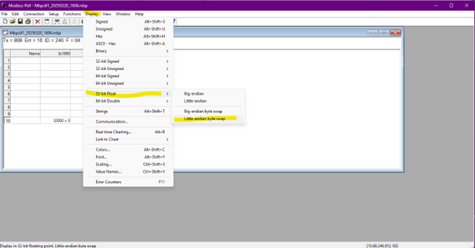 - Open “Display” menu item, select 32-bit Float > Little-endian byte swap: