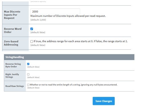 Under Advanced, checkmark “Reverse Word Order” and “Reverse String Byte Order” (not checked by default), then Save Changes (These are the settings to use if using “Format Code 0” defined in the transmitter’s modbus configuration, which is the default):